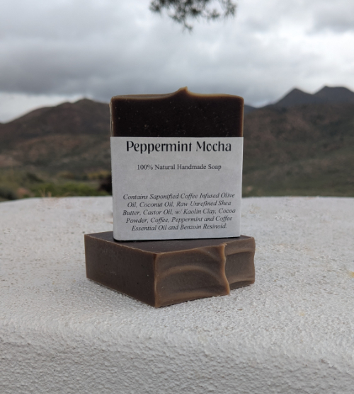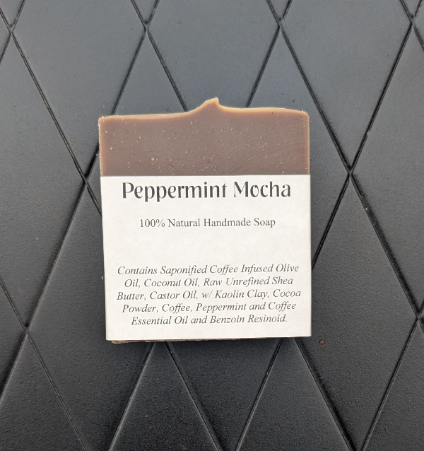 Ingredients: Saponified Oils (Coffee infused Olive Oil, Coconut Oil, Raw Unrefined Shea Butter, Castor Oil), Kaolin Clay, Cocoa Powder, Coffee, Peppermint and Coffee Essential Oil and Benzoin Resinoid.